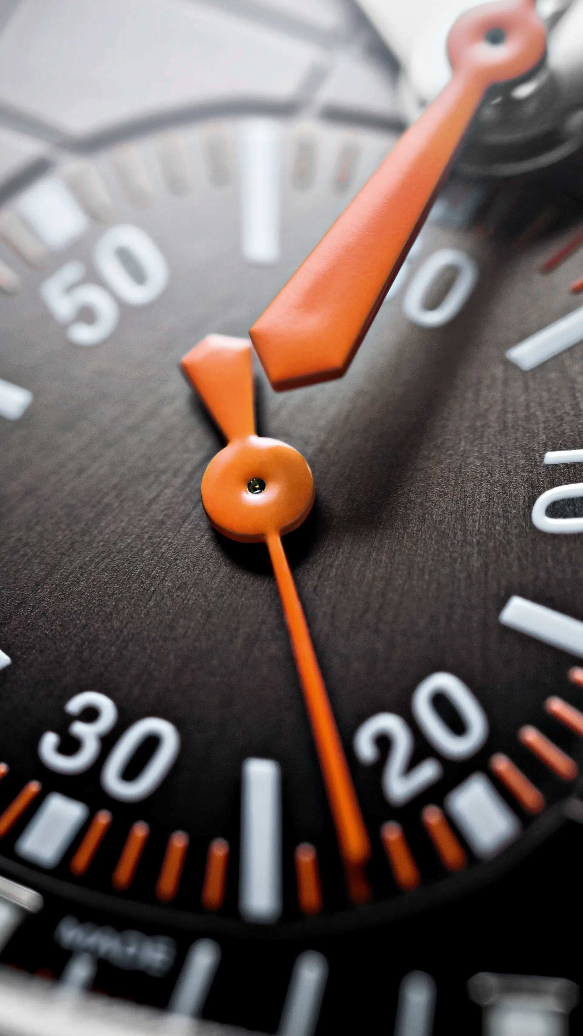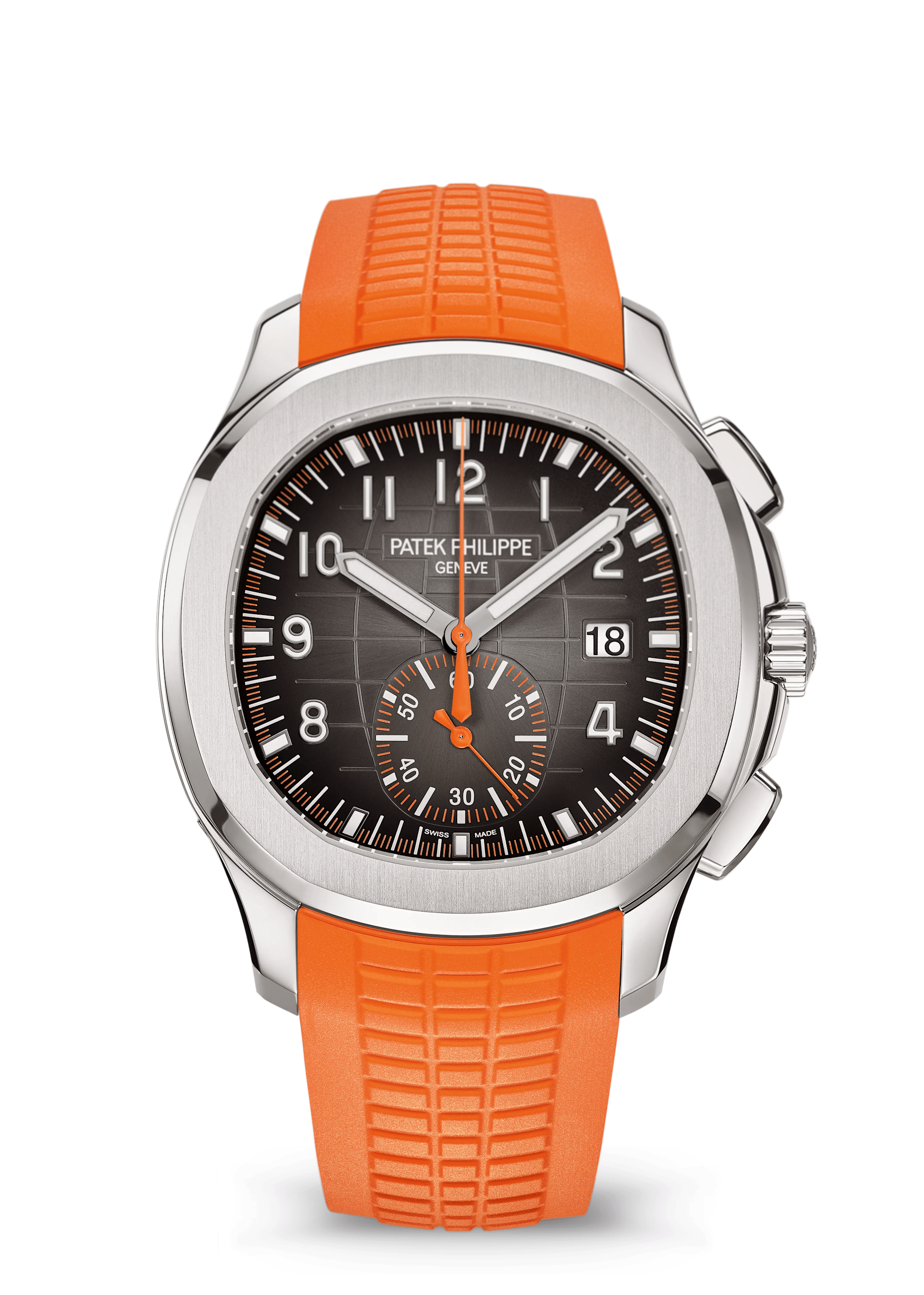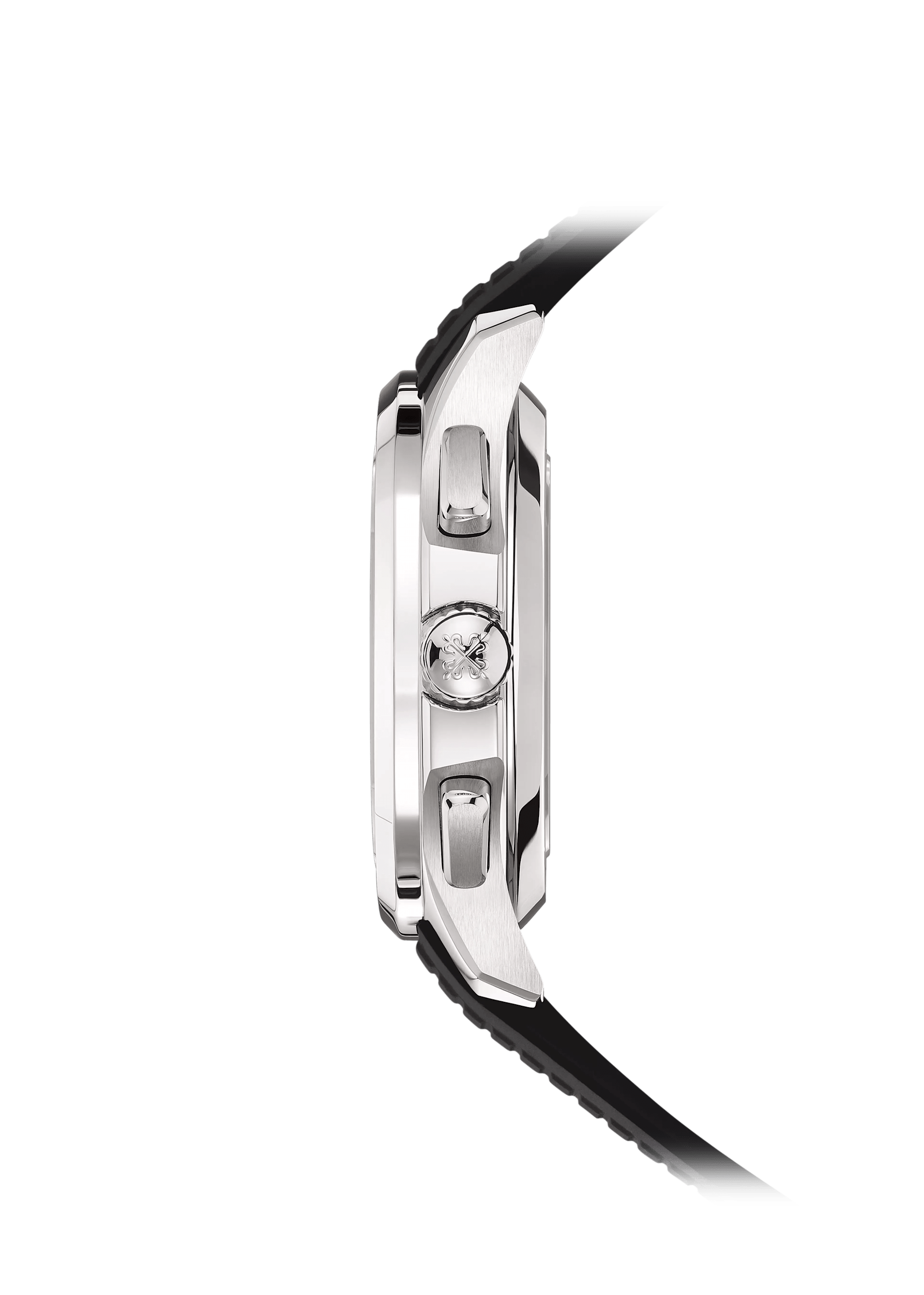 Equipado com um movimento cronógrafo flyback automático, este Aquanaut em aço apresenta um design original e marcante, com as indicações do cronógrafo destacando-se em laranja sobre o fundo preto do mostrador. Ele vem com duas pulseiras pretas ou laranja em um material composto ultrarresistente, presas por um fecho dobrável Aquanaut.