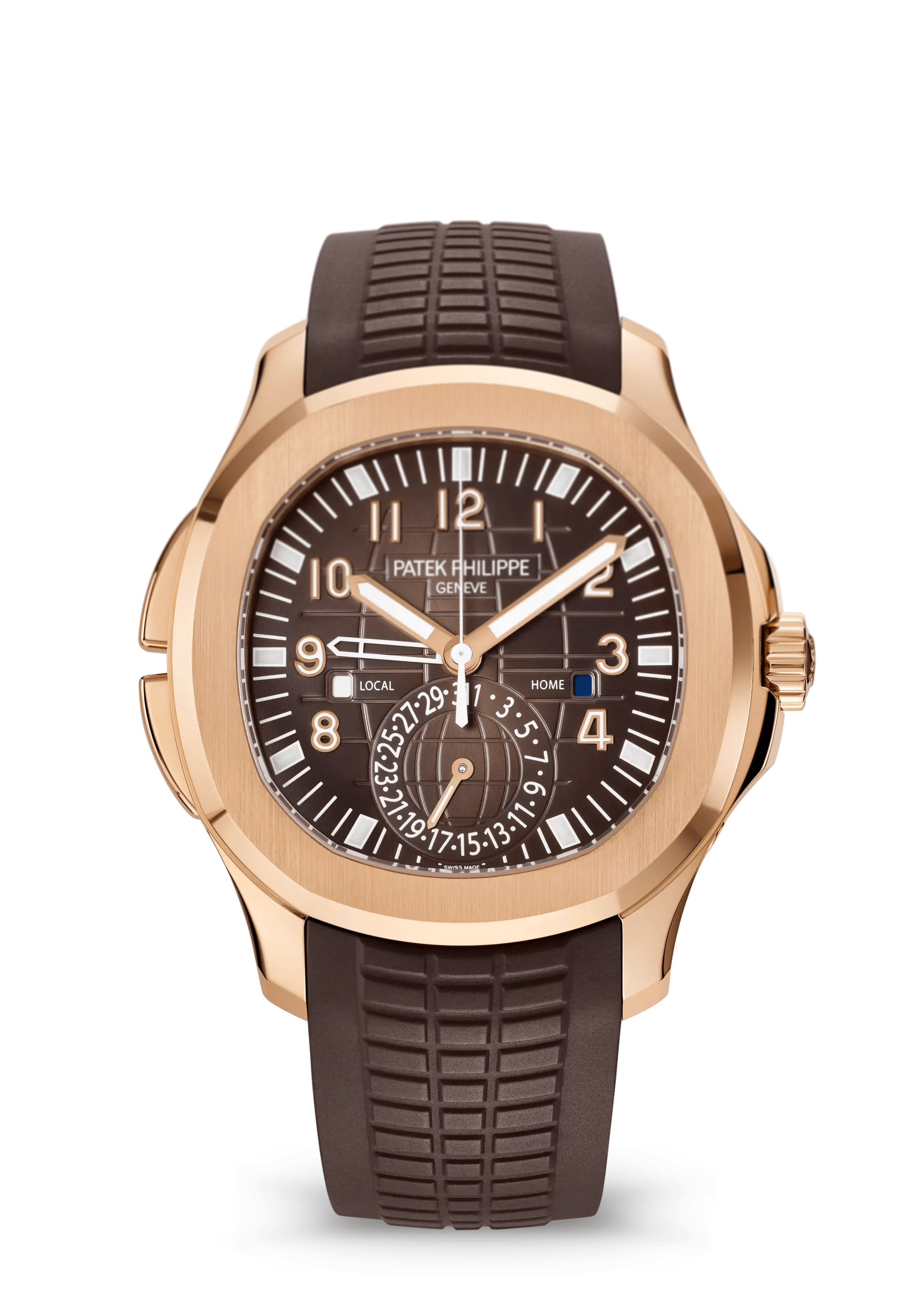 Marrom sunburst com aro em degradê preto, padrão Aquanaut em relevo, numerais aplicados em ouro rosa com revestimento luminescente branco. Ponteiros em ouro rosa estilo bastão com revestimento luminescente branco.