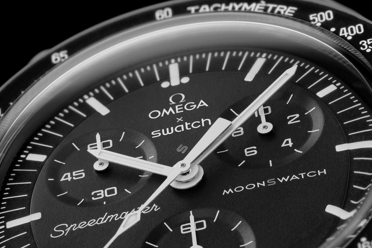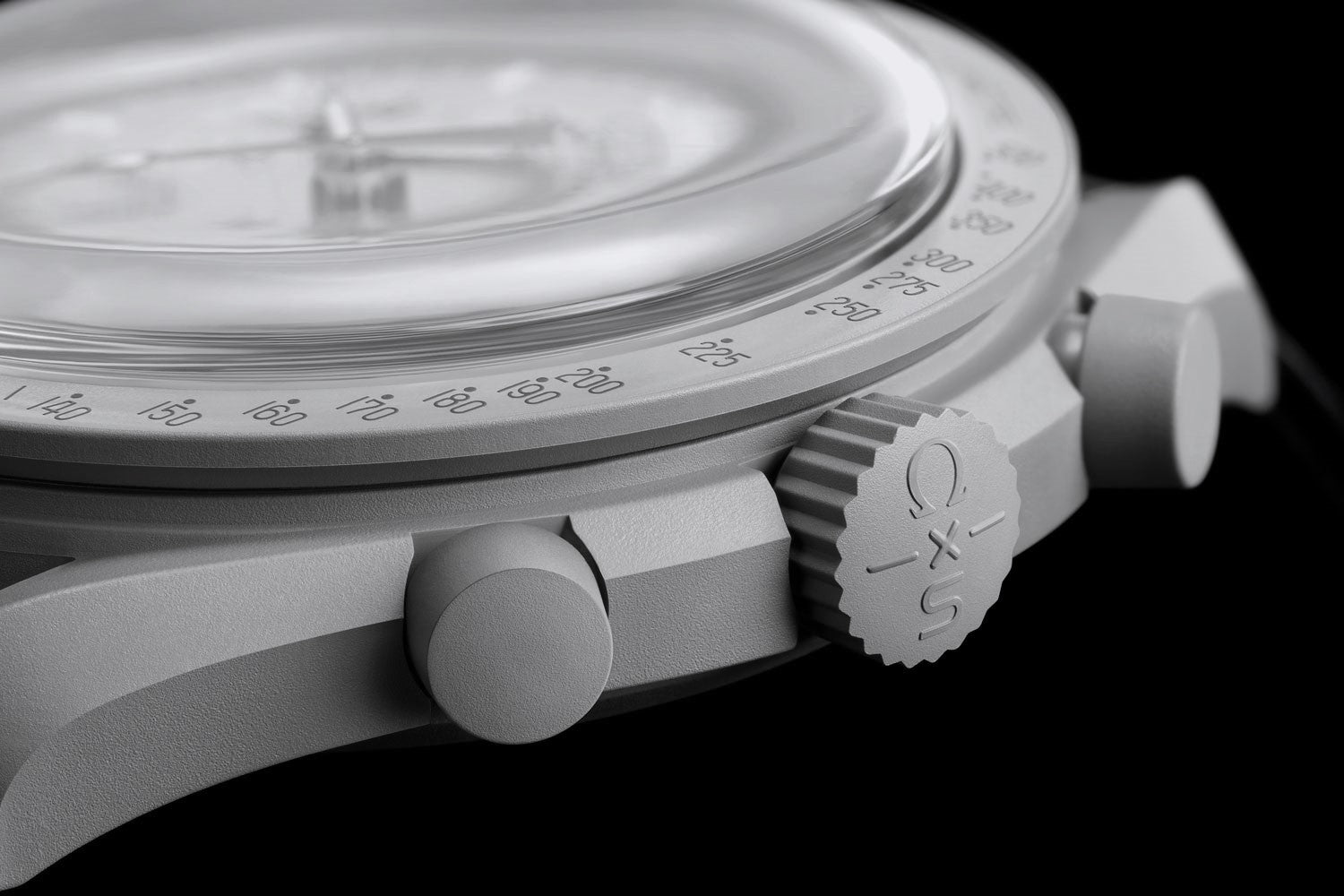 Todos os mostradores apresentam a marca OMEGA X Swatch, o icónico logótipo Speedmaster e o novo logótipo MoonSwatch. Um olhar mais atento à construção do vidro abobadado de origem biológica revela o "S" "oculto" integrado no centro do vidro. O padrão circular no anel exterior do mostrador e os mostradores secundários embutidos conferem um toque refinado ao design, complementando a construção nítida e suave das asas. Os ponteiros das horas, minutos e segundos do cronógrafo, assim como os marcadores das horas têm Super-LumiNova® para um brilho perfeito no escuro.